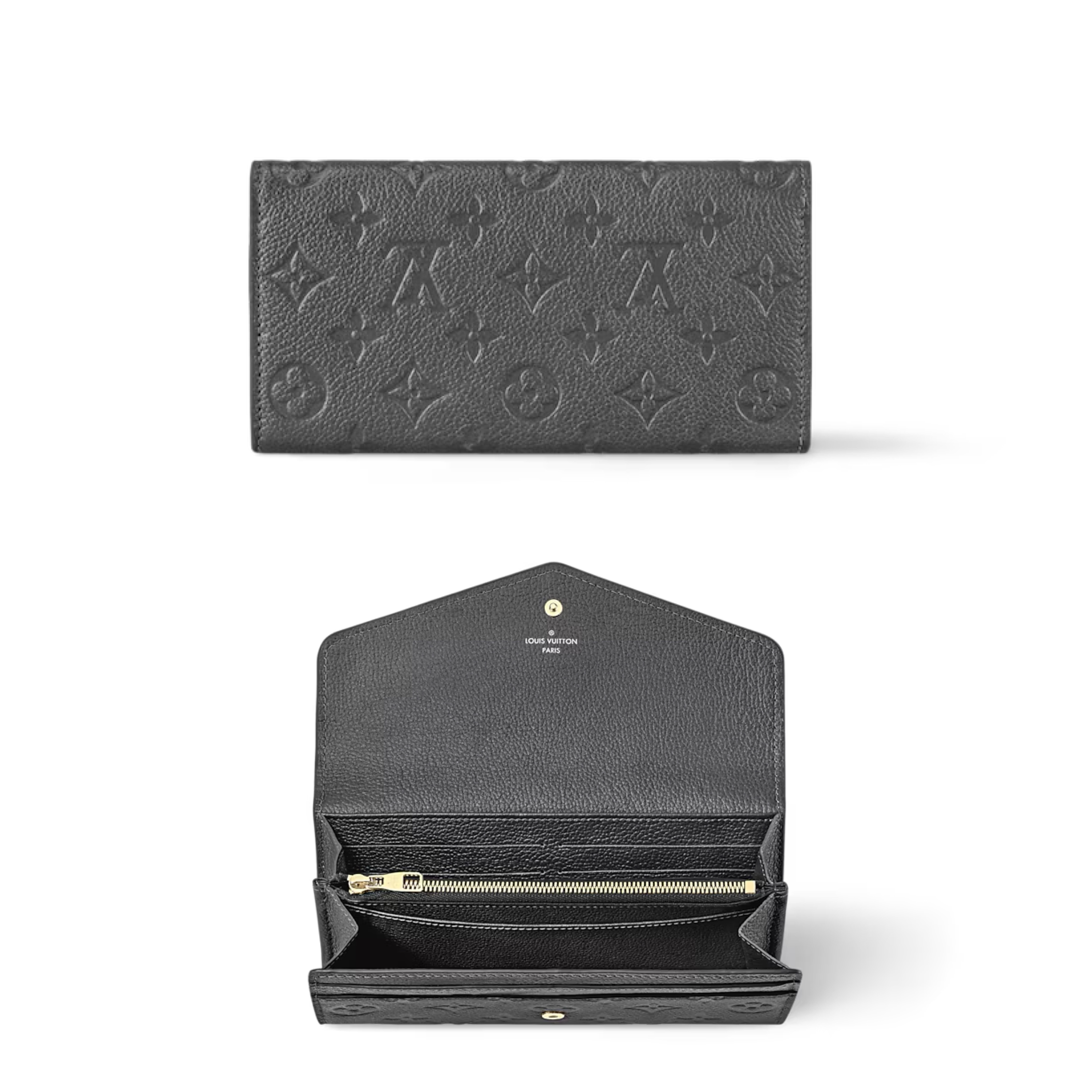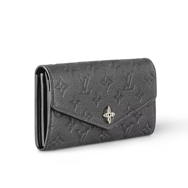 LVスキーコレクションから、このサラ「シメリー」エディションの財布は、象徴的なモノグラムインプレインテレザーで作られ、モノグラムの花で飾られたスナップクロージャーを備えています。