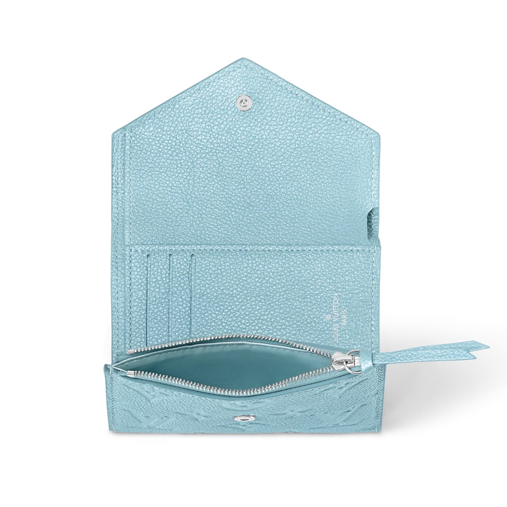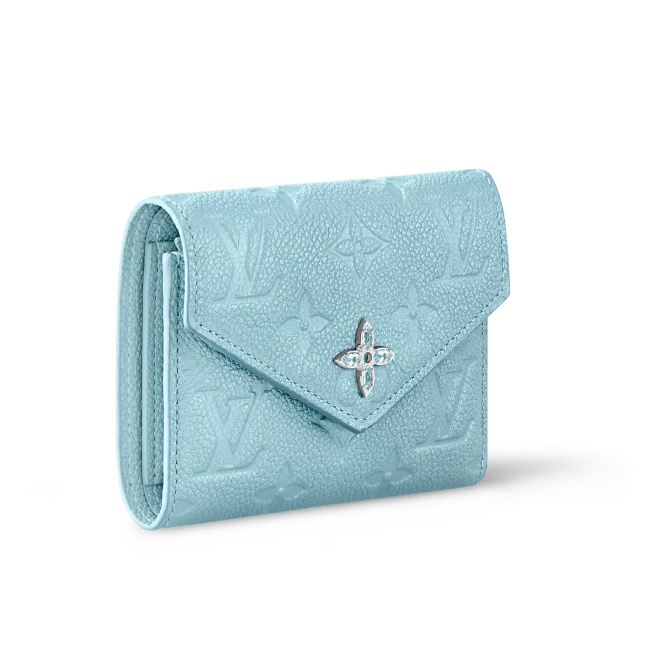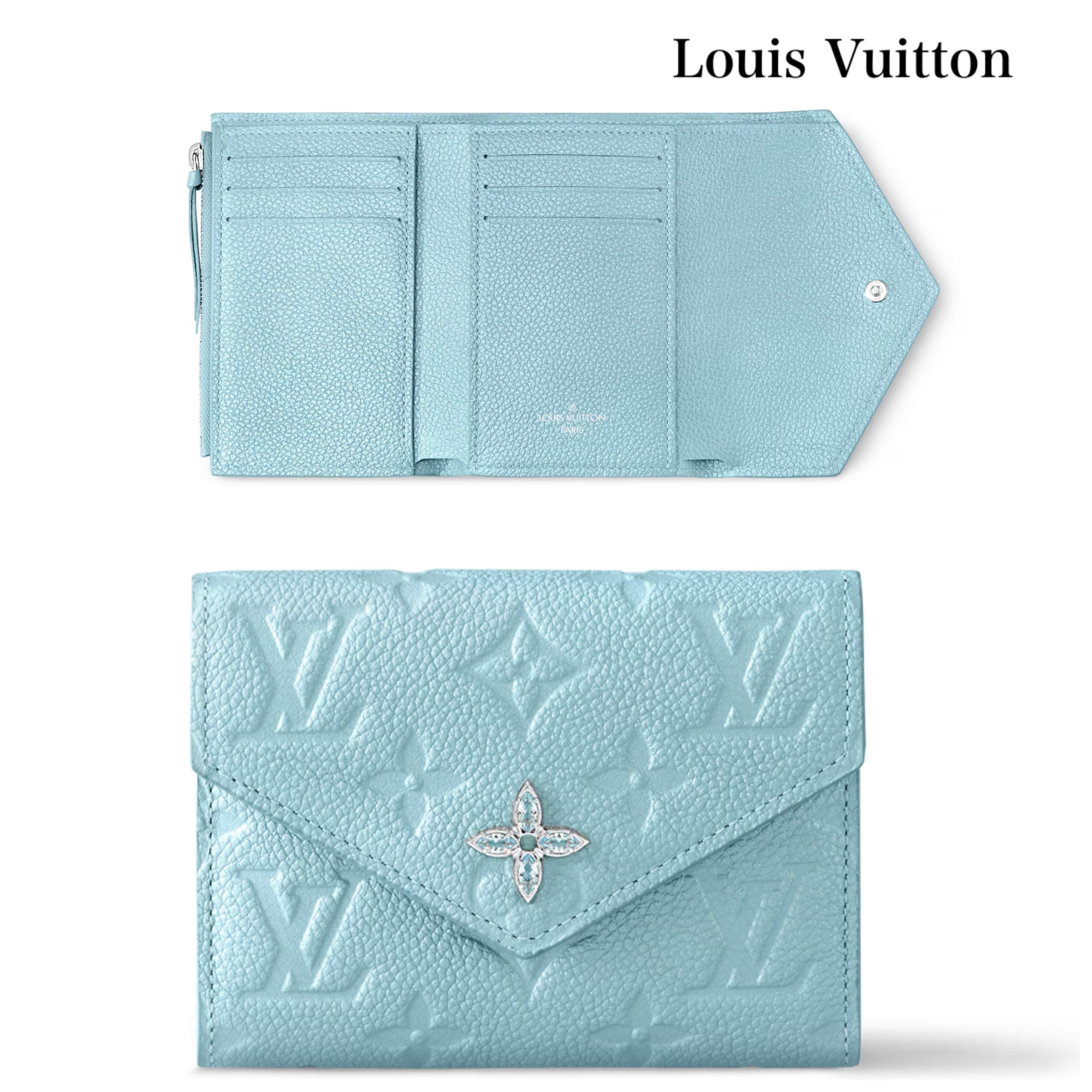 LVスキーコレクションから、このビクトリンウォレットは、きらびやかな仕上げのエレガントなアズールフロストシェードで際立っています。モノグラム・エンプラインテレザー製で、輝くクリスタルで強化されたモノグラムフラワースナップボタンがポイント。