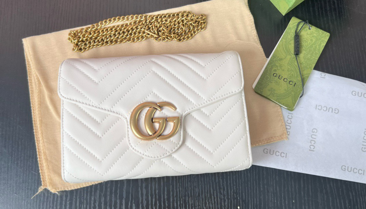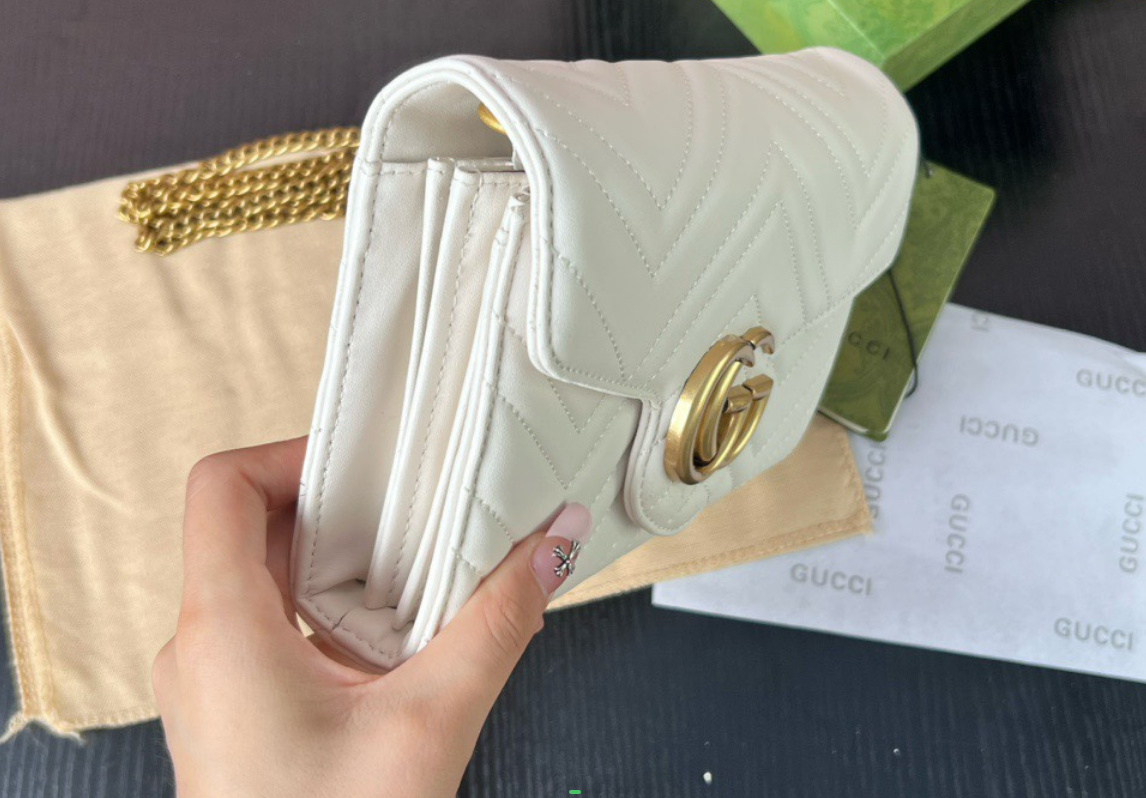 シェブロン キルティング レザーの〔GGマーモント〕 ミニチェーンバッグ。バックのGGが印象的です。