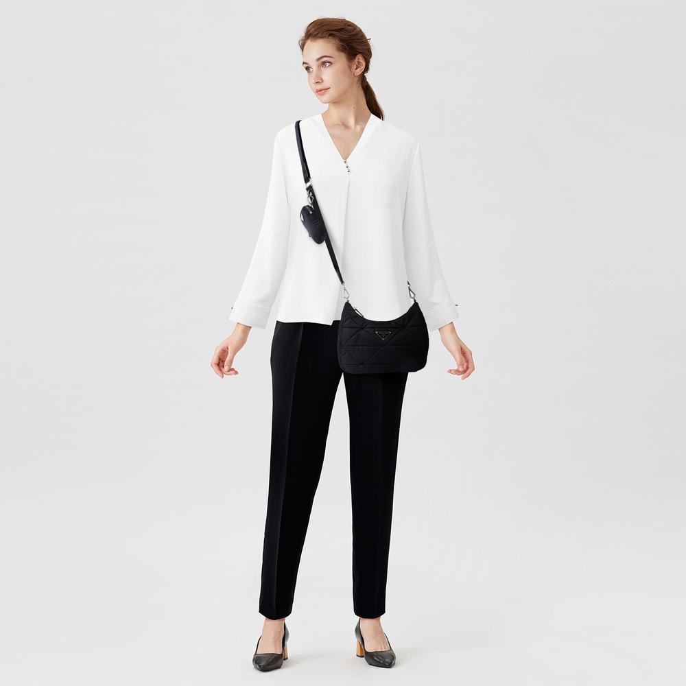 トライアングルのパッチワークステッチが特徴的な、ナイロンのパッド入りショルダーバッグ。調節可能なロゴプリント入りナイロンショルダーストラップが備わっています。フロントにアイコニックなエナメルメタルのトライアングルロゴがあしらわれた多機能なバッグ。ショルダーストラップにフックで取り付けられる、取り外し可能なファスナー付ナイロンポーチが備わっています。
