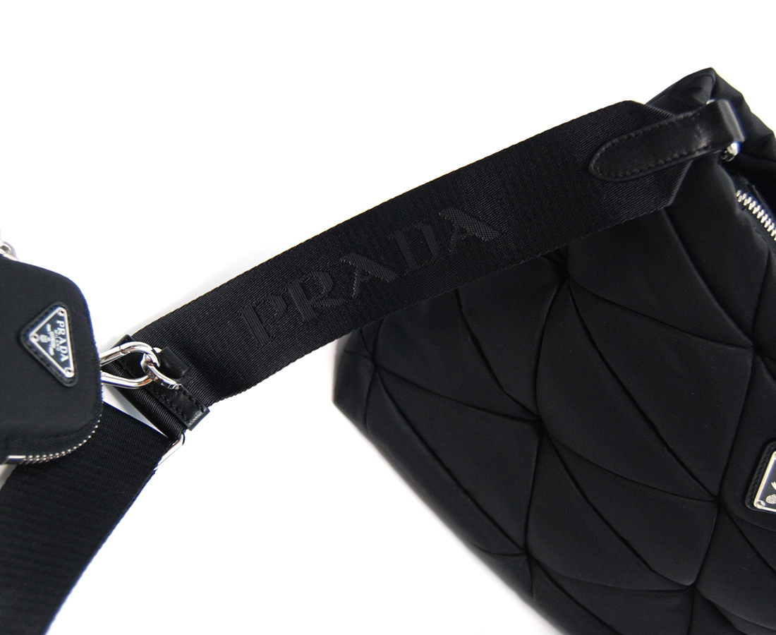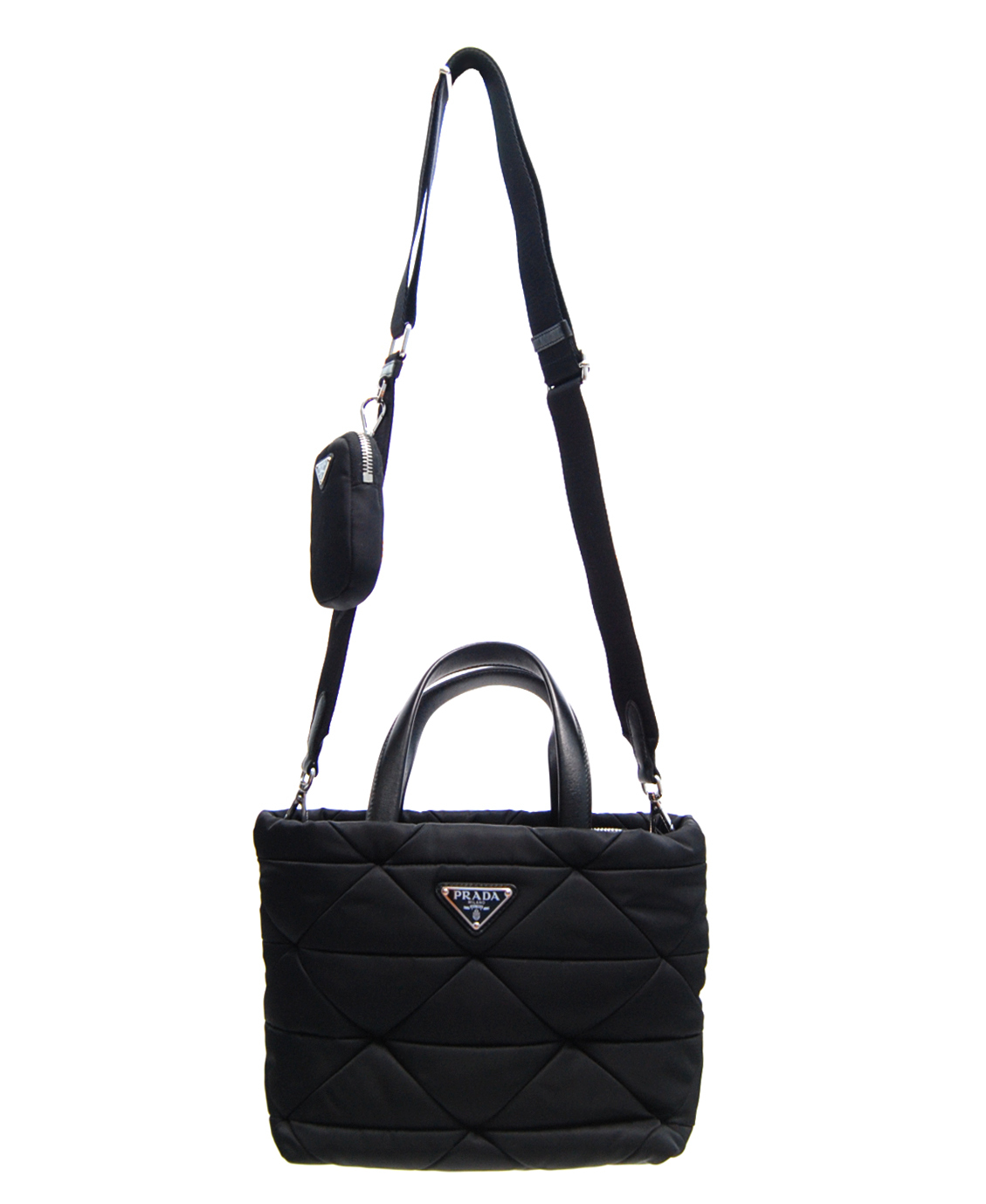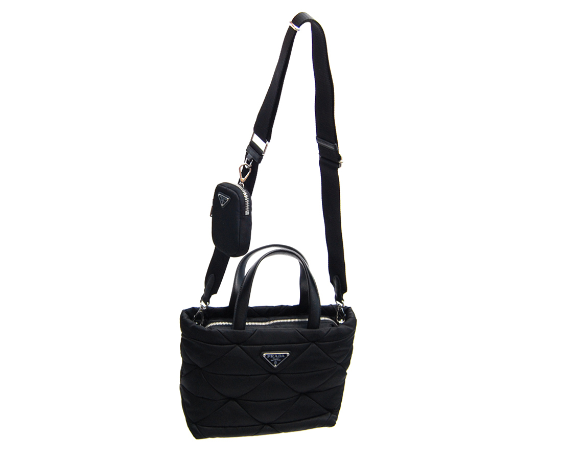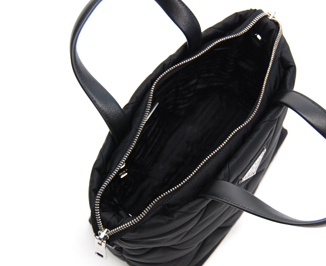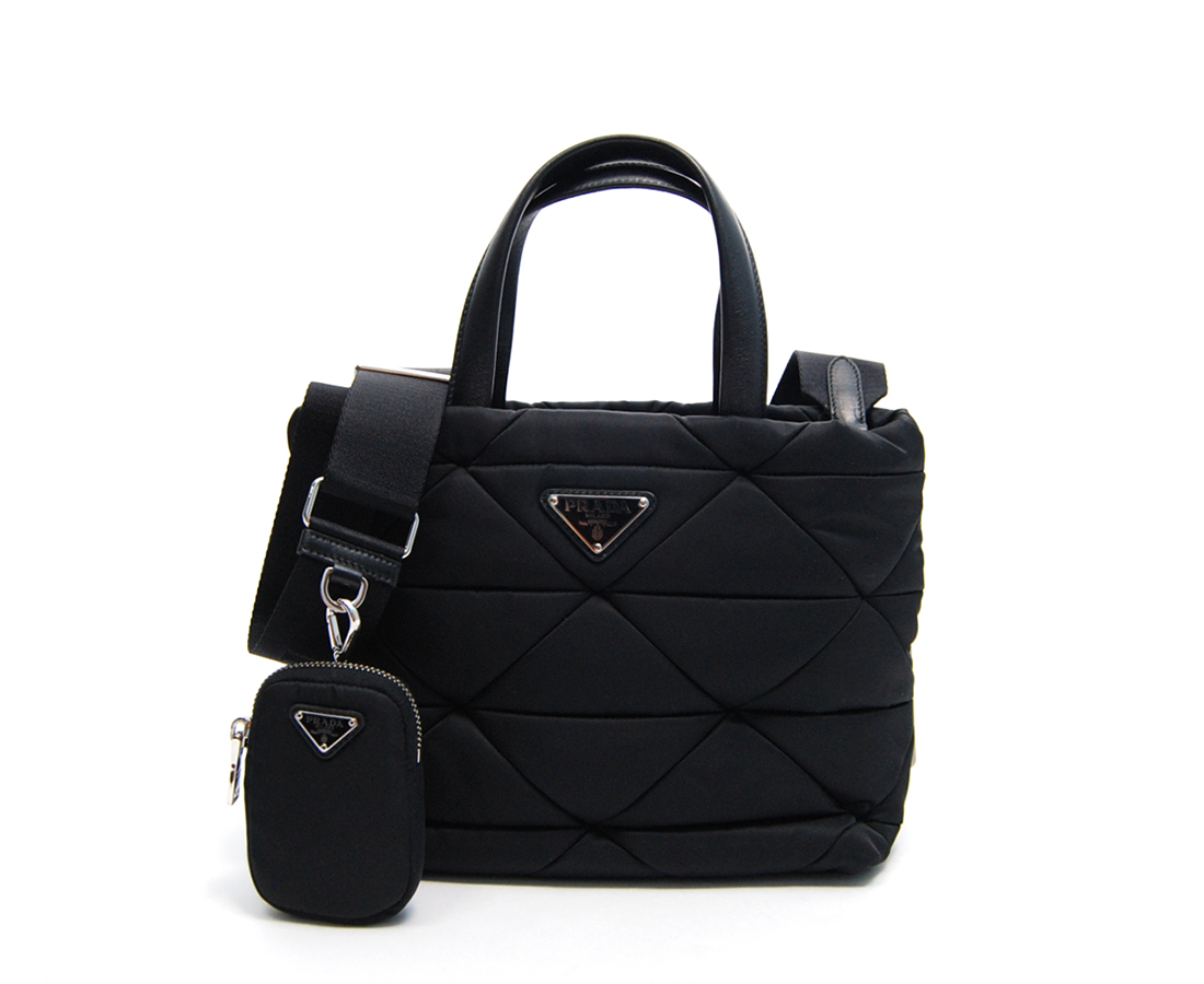・ナイロンにあしらわれたキルティングモチーフがエレガントで柔らかな印象を醸し出しながらも、コントラストの効いたアイコニックなトライアングルロゴとナッパレザー(羊革)のハンドルがスタイリッシュな表情を引き立てる多機能なナイロンパデッドトートバッグ。ショルダーストラップに取り付けられる、取り外し可能なナイロンポーチを備え、様々なシーンでカジュアルにお使いいただけるアイコニックなバッグです。