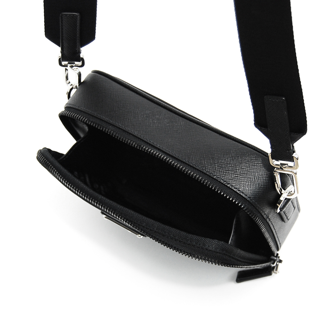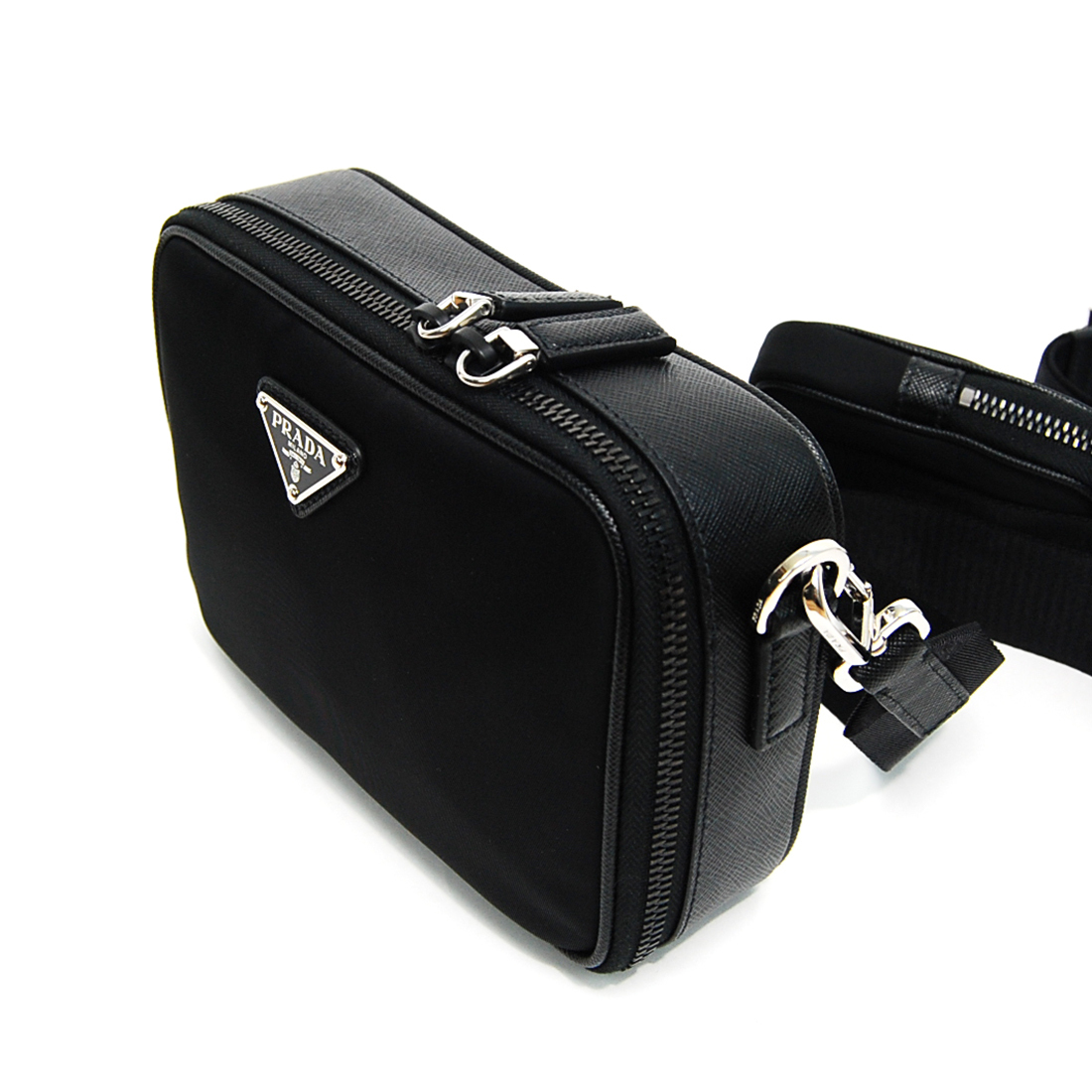 プラダ サフィアーノレザー+Re-Nylon クロスボディバッグ, エレガントでモダンなレザー+ Re-Nylon のクロスボディバッグ。ショルダーストラップ、メタル トライアングルロゴがあしらわれています。