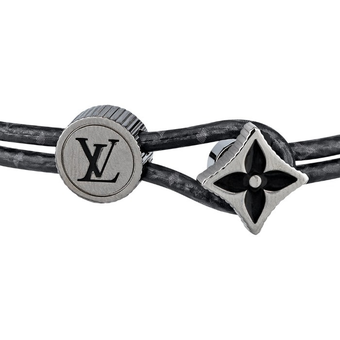 シルバーカラーの2つのチャームによる留め具が特徴の、調節可能なアイテムです。
