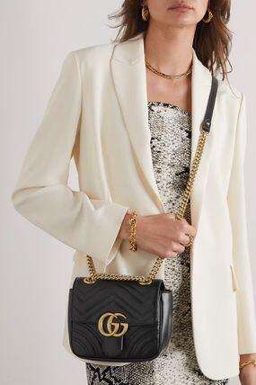 シグネチャーカラーの新シルエットにスポットライトを当てた、最新の〔GGマーモント〕コレクション。ブラックのシェブロン キルティングレザーを用いたこのトップハンドルバッグには、取り外し可能なトグルを備えたライトゴールドトーンのチェーンストラップが付属します。ダブルGを飾ったマグネットフラップ クロージャーを配して仕上げました。
