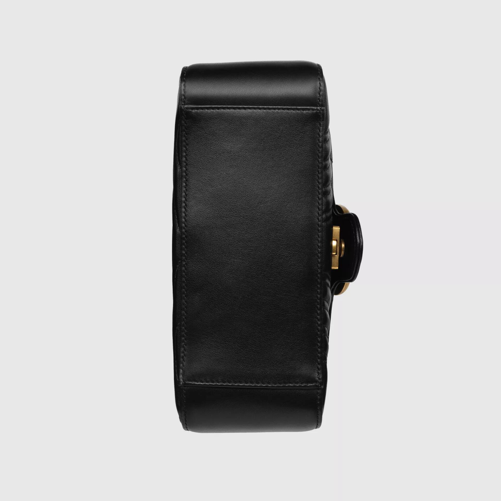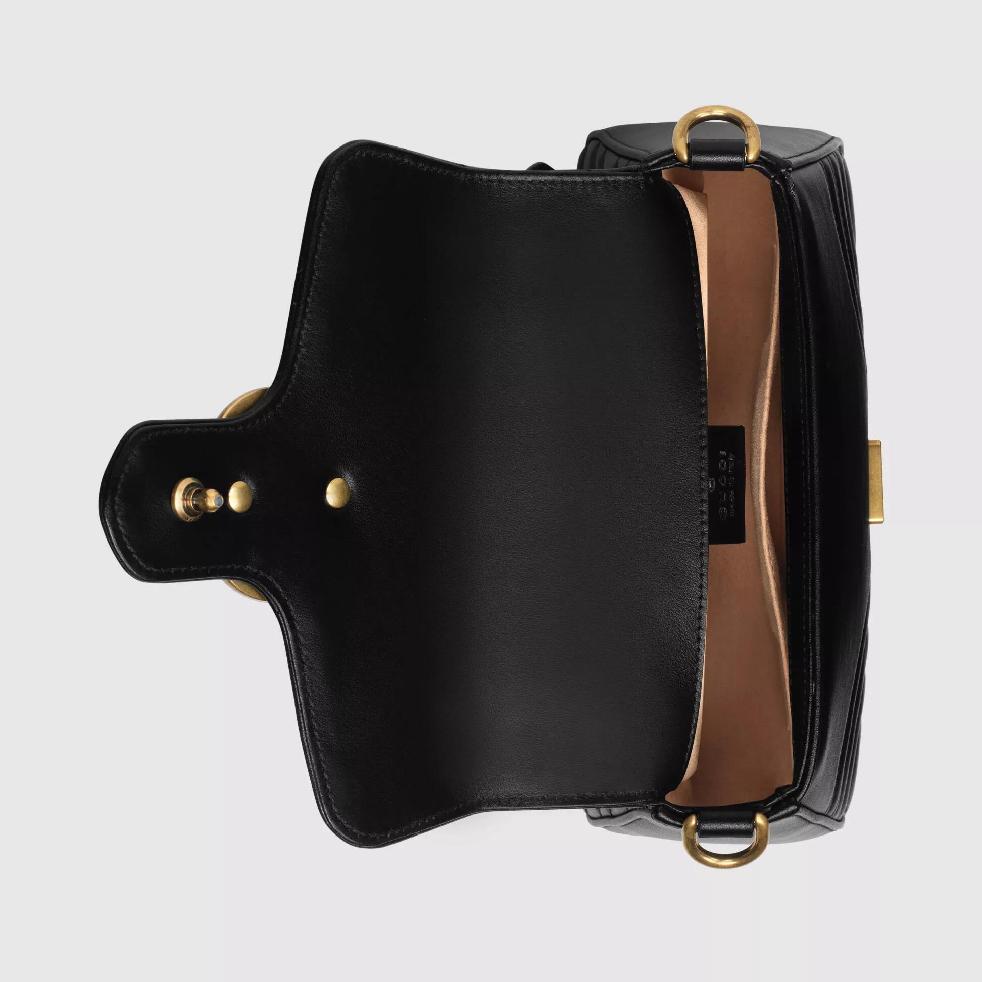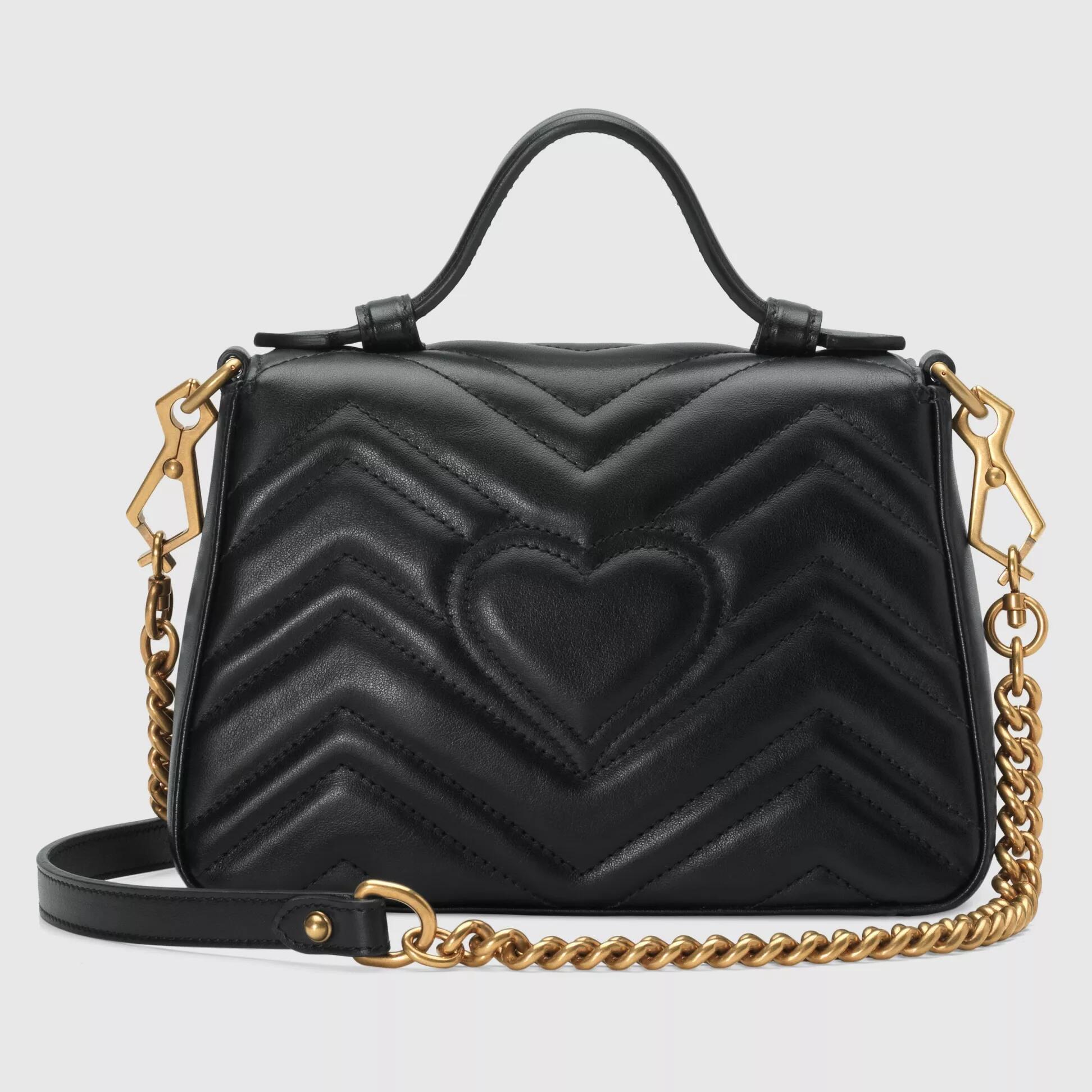 ソフトなストラクチャードシェイプにダブルG ハードウェア付きのオーバーサイズ フラップ クロージャーを組み合わせた〔GGマーモント〕の最新作。シェブロン デザインのキルティング レザーを使用し、バックにハートをあしらったデザイン。レザー トップハンドルとチェーン ショルダーストラップが付いています。