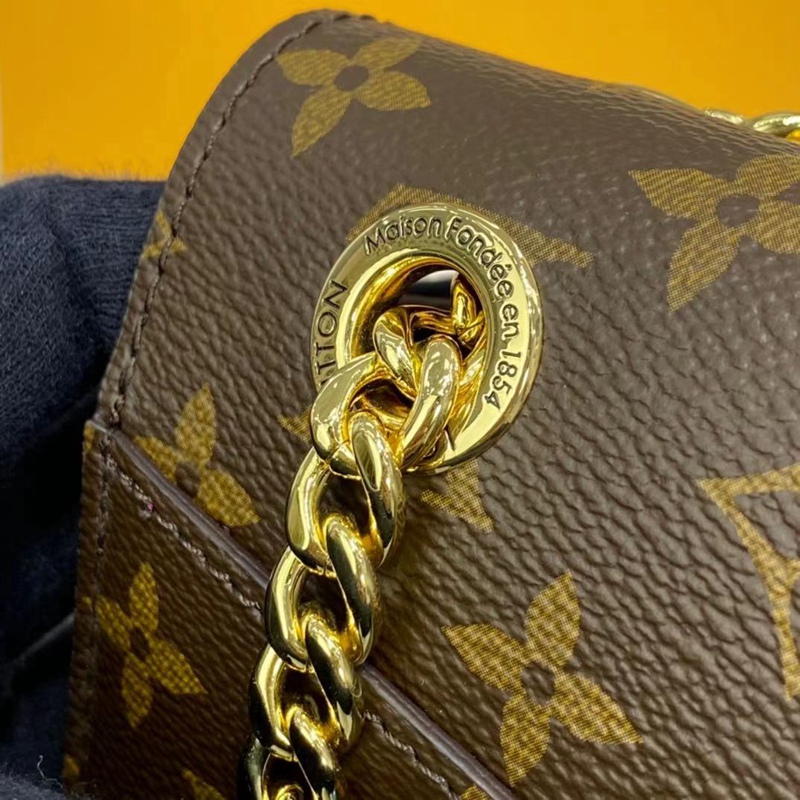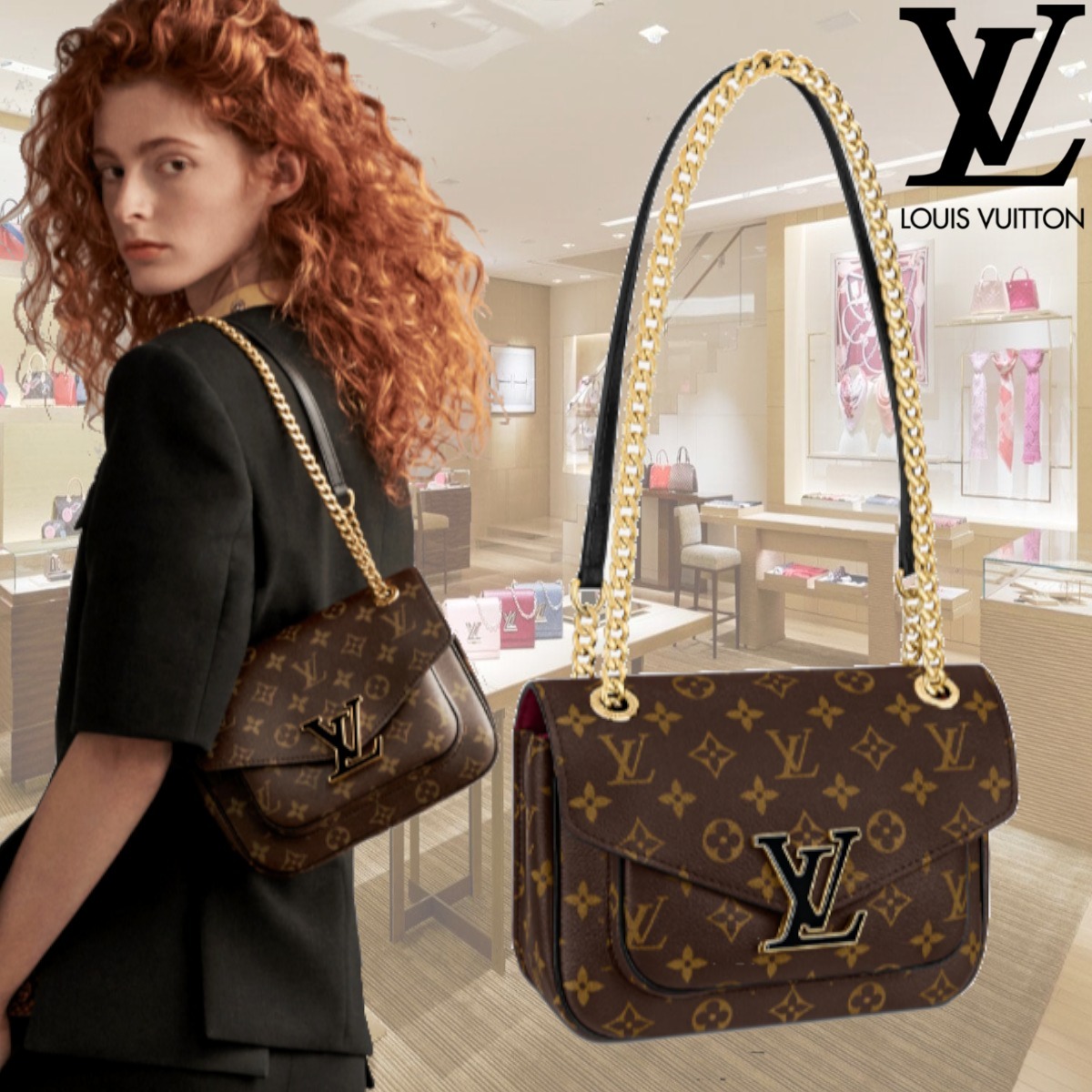 モノグラム・キャンバスで仕立てたコンパクトなボディにスライド式チェーンをあしらい、究極のカジュアルシックを表現した「パッシー」。デイタイムからイブニングシーンまで活躍する機能的なバッグです。フロントと背面には必需品をすぐ取出せる外ポケットを、内側には2つのポケットを備えています。ブラックのレジンを使用したLV イニシャルが美しいマグネットスタイルの留め具を、ゴールドカラーの縁取りで仕上げました。